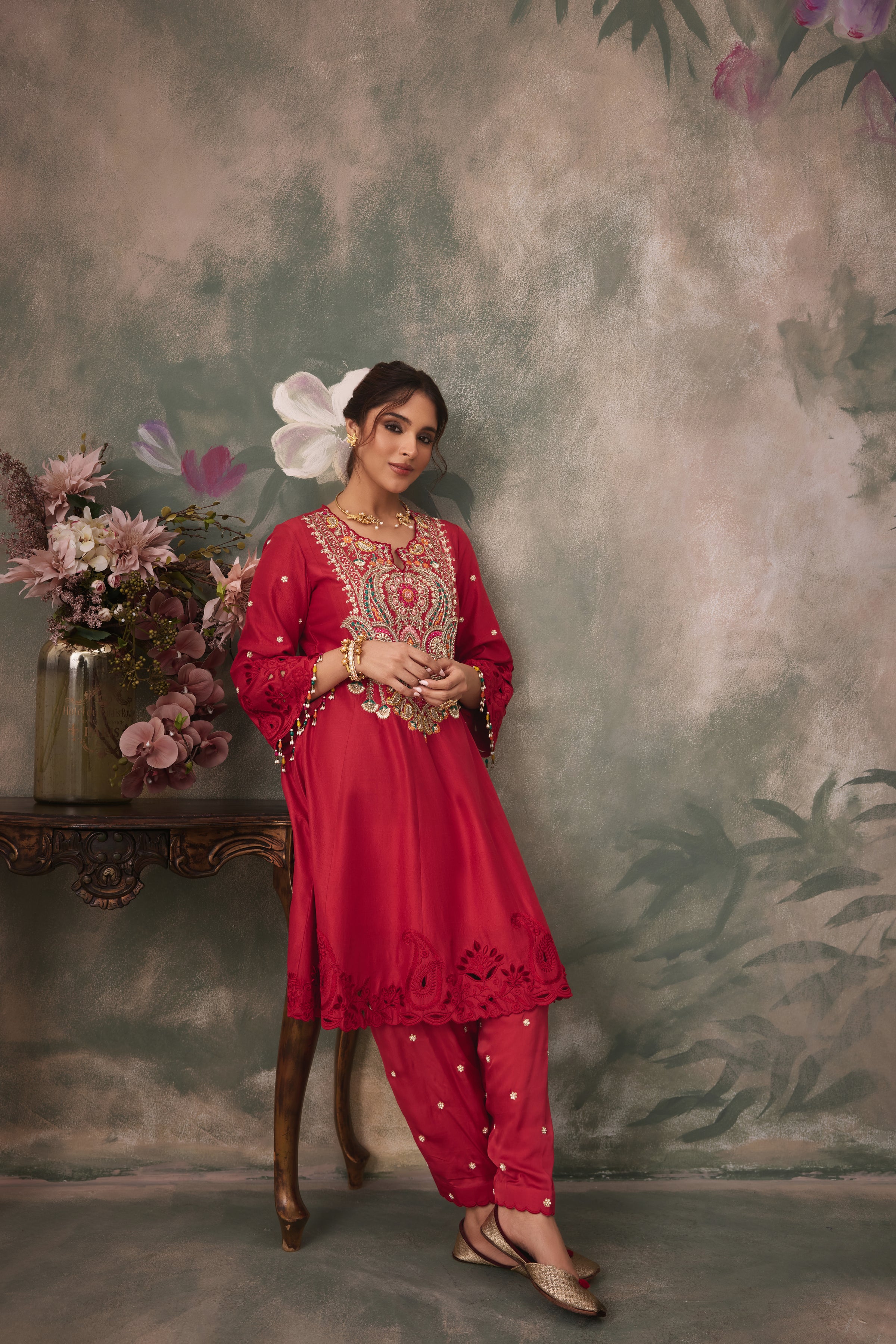 Crafted with a pure silk kurta and satin salwar, the Rehmat Kurta Set balances elegance with comfort. The bold red hue adds vibrancy, making it an effortless choice for both day and evening occasions.