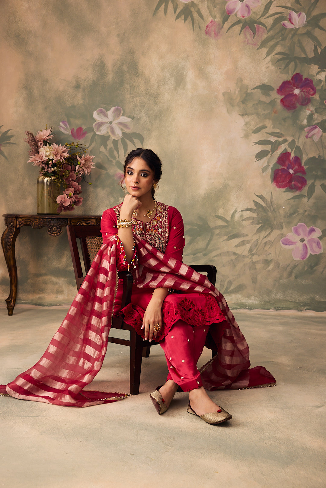 Crafted with a pure silk kurta and satin salwar, the Rehmat Kurta Set balances elegance with comfort. The bold red hue adds vibrancy, making it an effortless choice for both day and evening occasions.