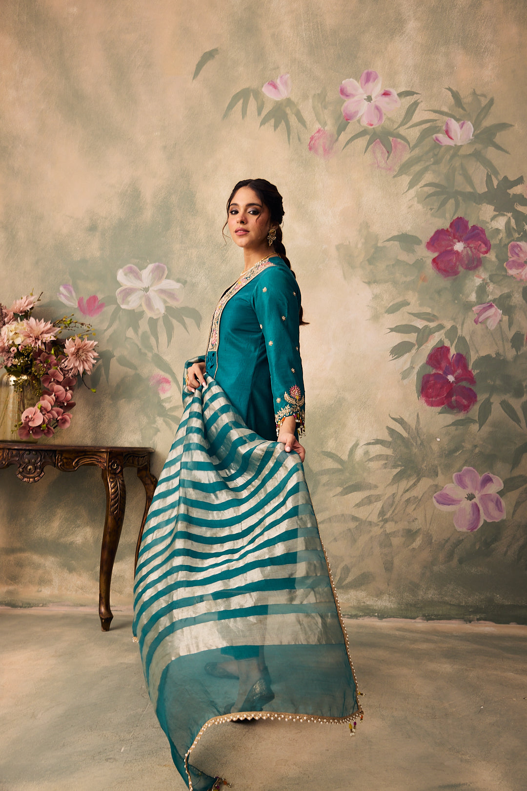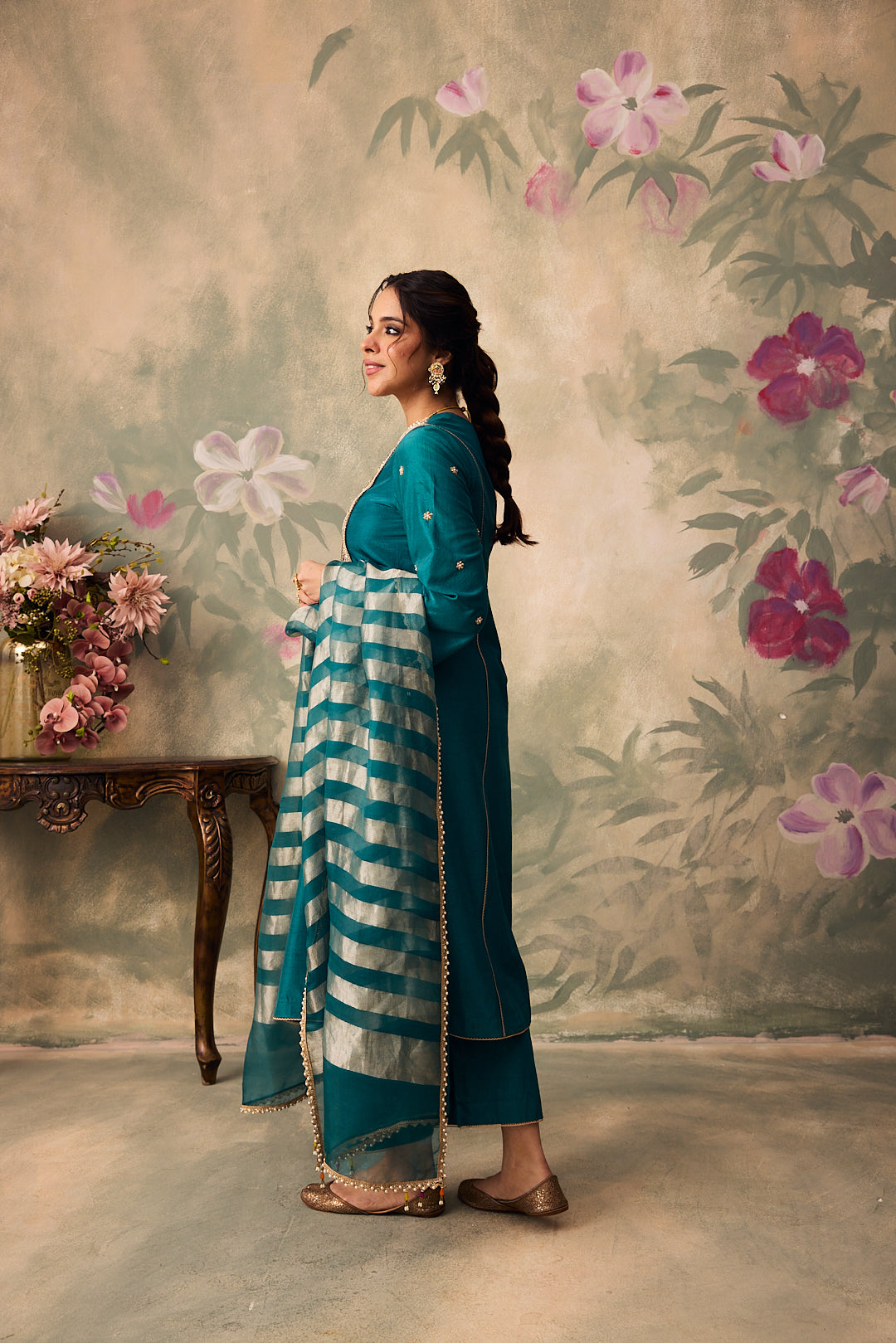The Saanjh Kurta Set embodies understated elegance with its clean lines and fluid fall. The teal green shade adds a serene charm, making it a refined choice for both day and evening wear.